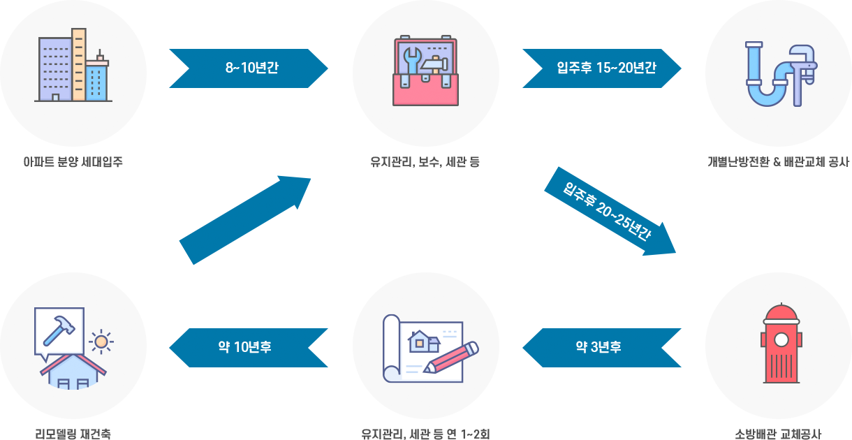 건축기계설비 공사란 아파트, 오피스텔, 관공서 등 건축물의 난방, 급수, 급탕, 가스 등 노후화된 설비를 최신의 상태로 교체하고, 기존 건축물에 적합한 방식으로 전환 및 재구성하여 효율적인 에너지 사용 및 유지관리를 목적으로 한다.