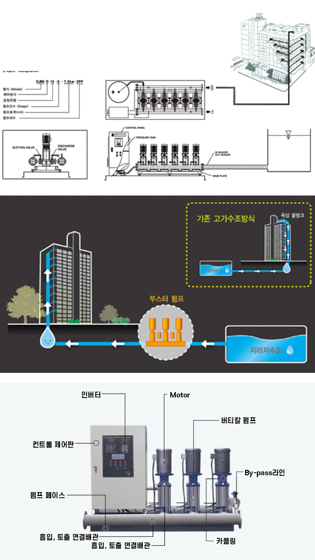 부스터펌프 시스템은 옥상 물탱크를 설치하지 않고 지하 저수조로부터 여러대의 펌프를 설치하고 급수사용량에 따라 회전수제어 및 대수제어하여 항상 일정한 압력의 급수를 사용처에 직접 공급 하는 자동급수장치입니다.