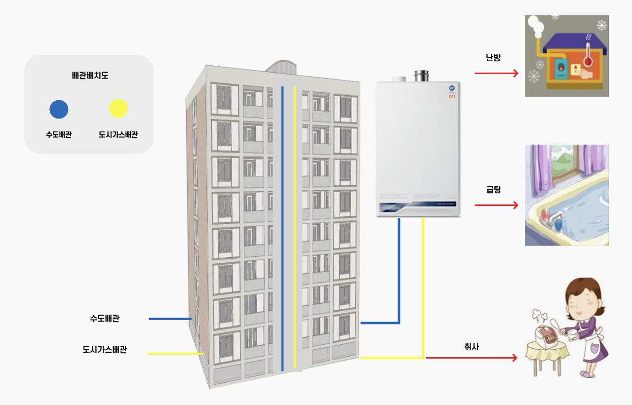 각 세대마다 개별보일러를 설치하여 난방, 급탕, 취사를 동시에 사용 할 수 있는 시스템으로 우리나라 온돌난방 문화에 적합한 최적의 난방방식