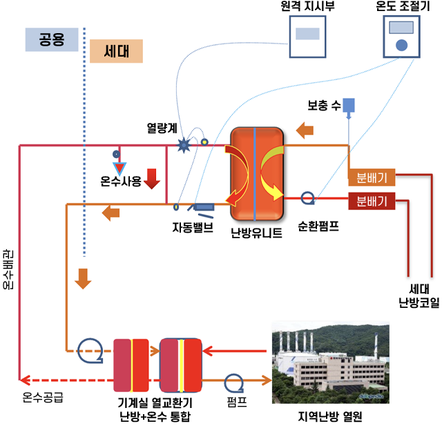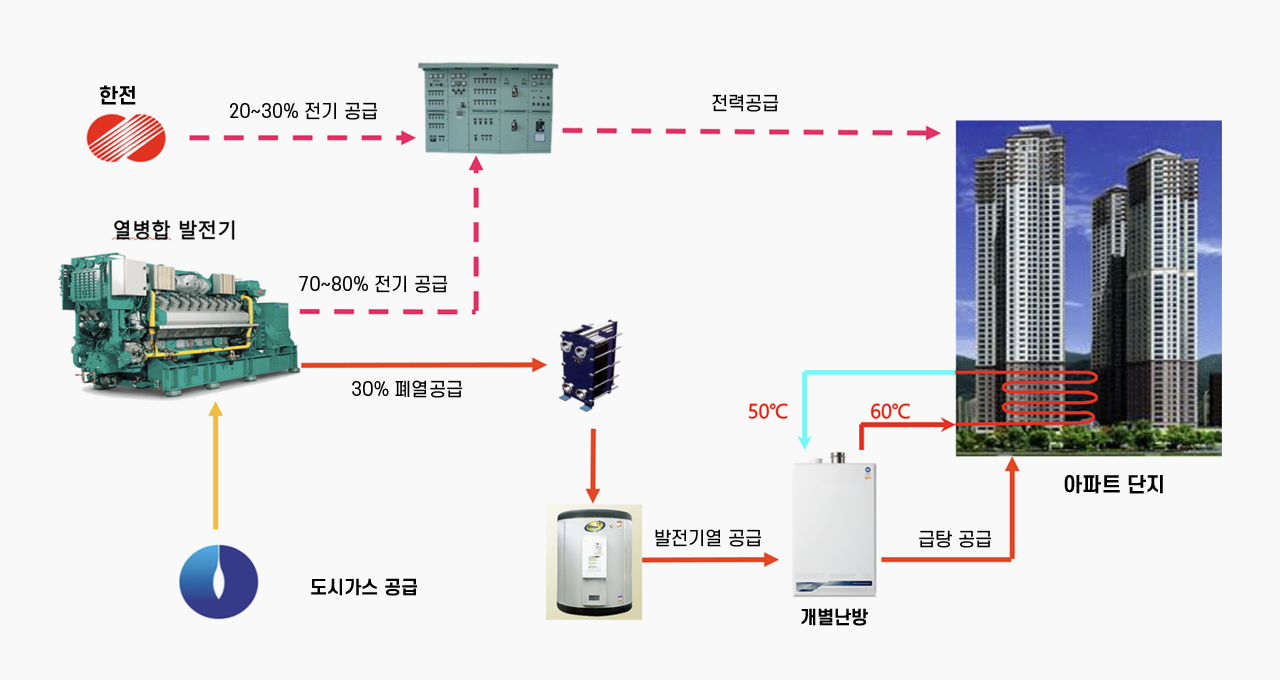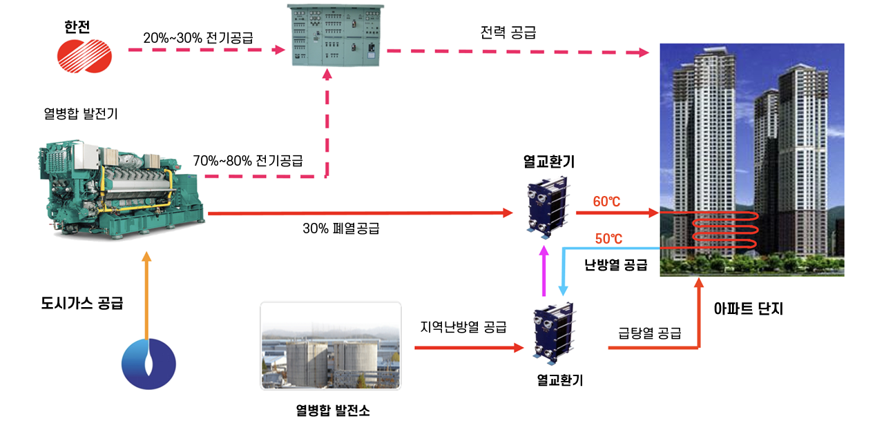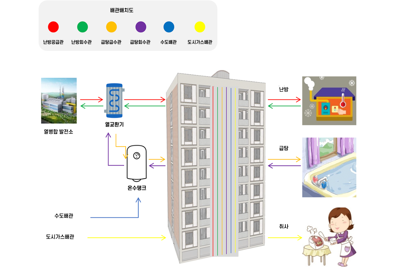 지역의 대형 열병합발전소에서 생산된 열을 열수송배관을 통해 난방과 급탕을 각 세대에 공급하고 취사는 별도의 도시가스를 사용하는 방식